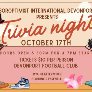Soroptimist International Devonport Trivia Night Soroptimist International Devonport Presents….TRIVIA NIGHT When: Friday 17th OctoberWhere: Devonport Football ClubJames Street.Time: 6.30 pm for a 7pm start.Tickets: $10... 17 Oct 6:30 pm - 7:00 pm