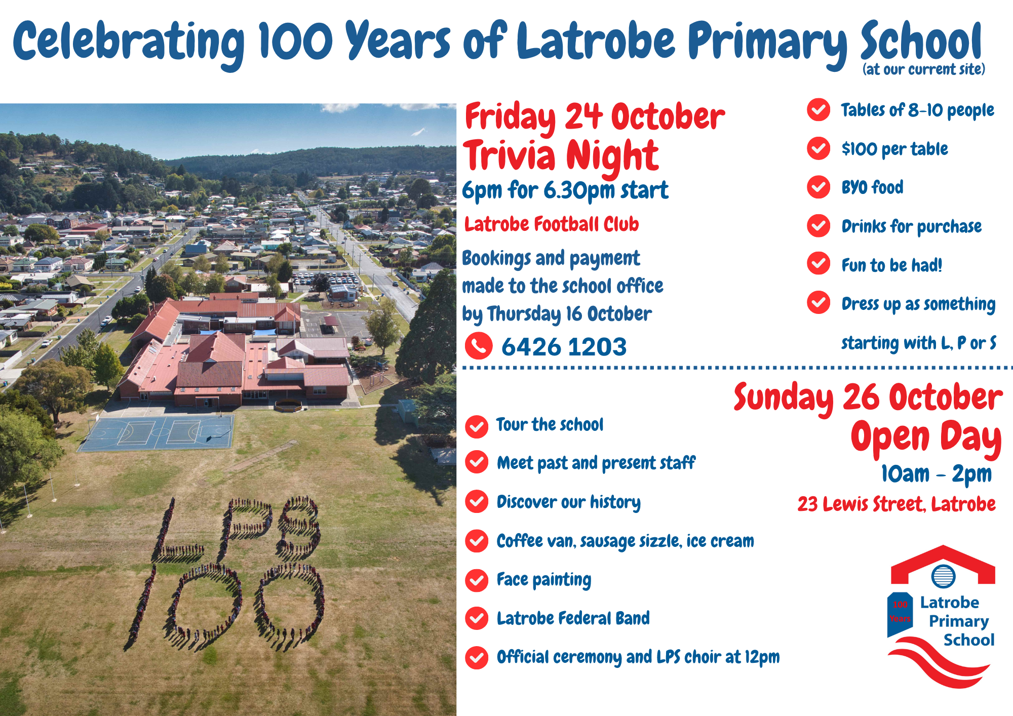 We’re holding a Trivia Night on Friday 24th October at the Latrobe Football Club, and then having an open day at the school on Sunday 26th October.