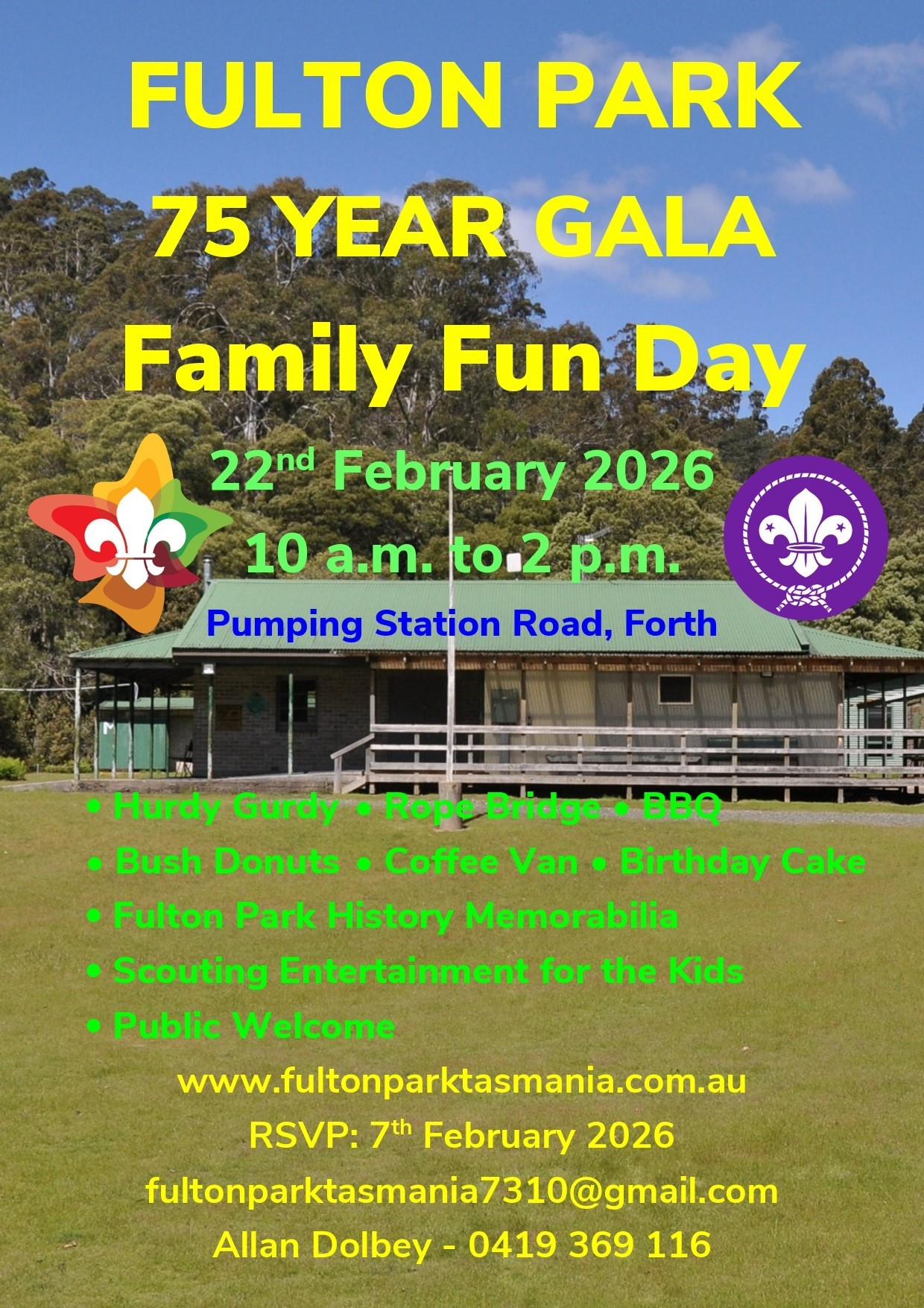 Mersey District Scouts are marking 75 years of the Fulton Park campsite at Forth with an open day on Sunday, February 22nd, from 10 a.m. to 2 p.m. Mr Urlic Champion donated the land so Scouts from Sheffield, Railton, Devonport, and Ulverstone could have a permanent campground.