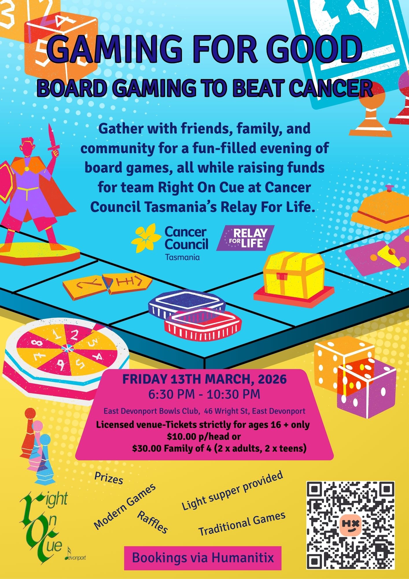 Gather with friends, family, and community for a fun-filled evening of playing table-top board games, all while raising funds for team Right On Cue at Cancer Council Tasmania’s Penguin Relay For Life 2026.