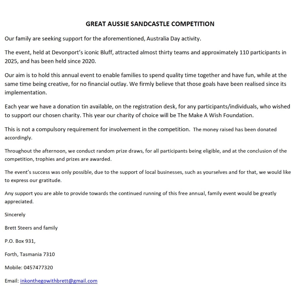 To support this event or for more information, please contact Brett Steers on 0457477320 or inkonthegowithbrett@gmail.com