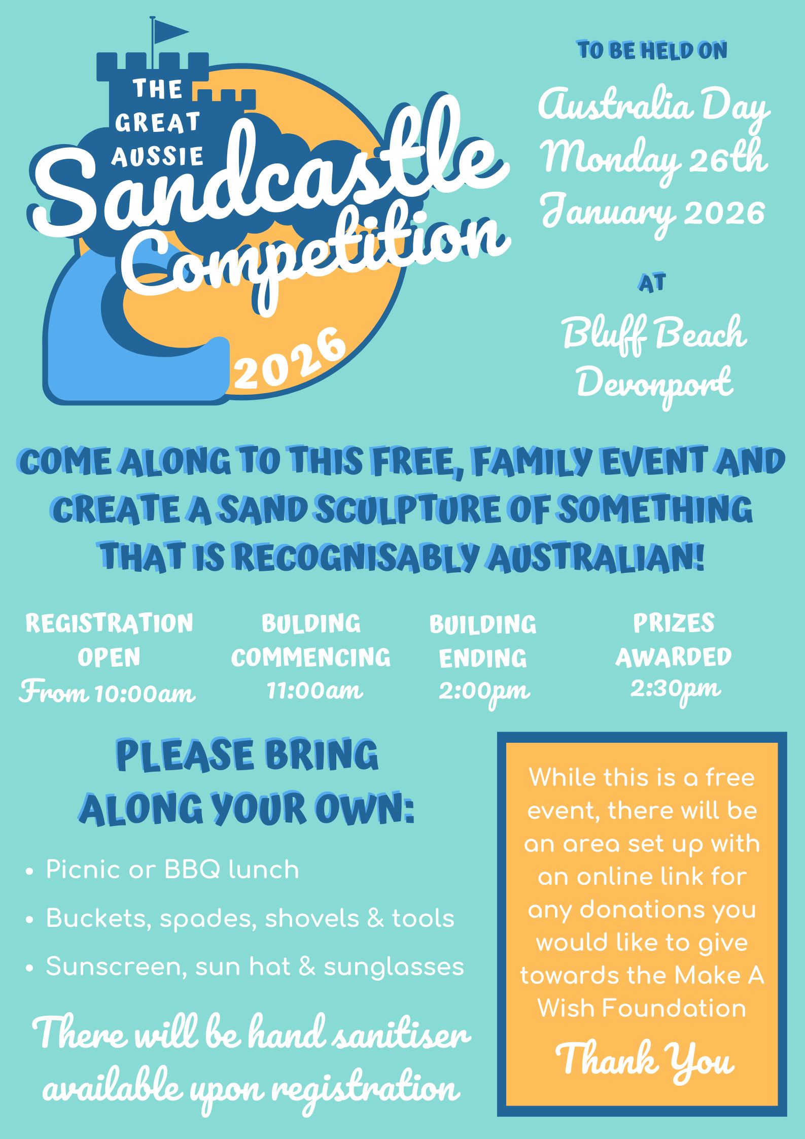 Come along to this free, family event and create a sand sculpture of something that is recognisably Australian for your chance to win some prizes, have fun in the sun and enjoy a day with community!